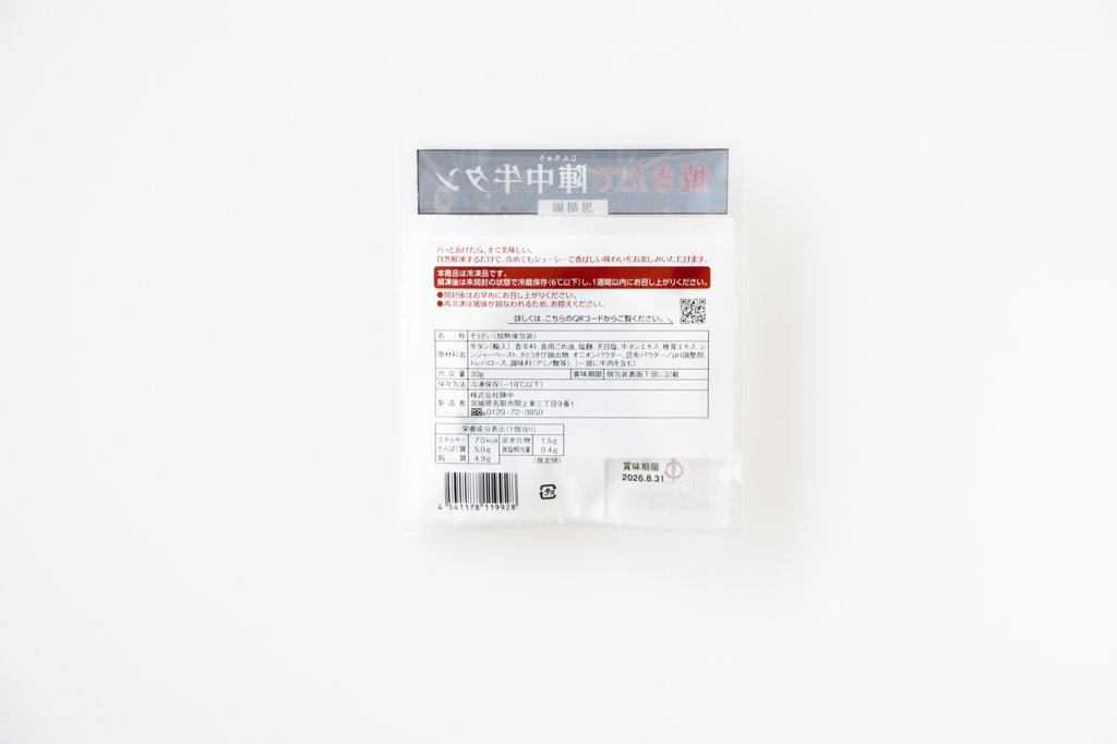 | 原材料 | 牛タン(輸入)、香辛料、食用こめ油、塩麹、天日塩、牛タンエキス、椎茸エキス、ジンジャーペースト、さとうきび抽出物、オニオンパウダー、昆布パウダー/pH調整剤、トレハロース、調味料(アミノ酸等)、(一部に牛肉を含む) |